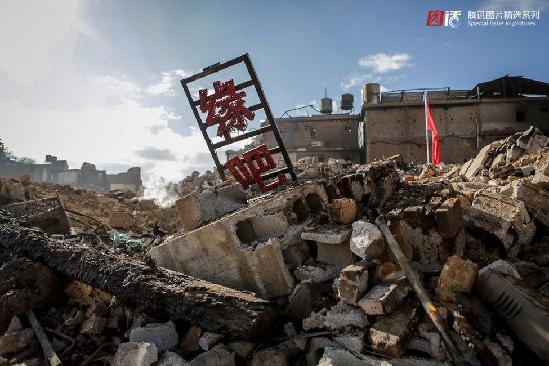 四方街上,一幅依然耸立在废墟中的酒吧招牌。