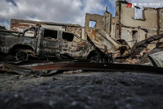 起火点如意客栈旁的一家餐厅门口,被烧只剩下铁皮的皮卡车。