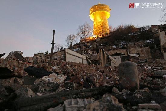 2014年1月15日,仓房街,一把被烧黑藏刀和一瓶煤气罐矗立在废墟上。山上是古城最为著名的转经筒。