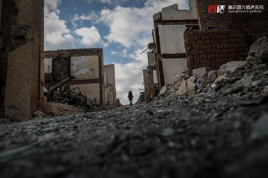 2014年1月15日,古城皮匠坡,一名曾经在此居住的住户行走在烧毁的废墟中。