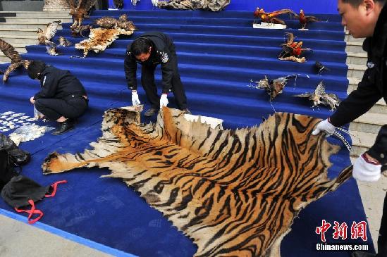 1月22日,云南省森林公安机关通报了1月10日破获的一起走私贩卖虎皮等国家重点保护动物制品案。该案共查获335件国家重点保护动物制品及标本,包括孟加拉虎虎皮3张、孟加拉虎幼崽死体1只、虎骨、狮骨、亚洲象皮等上百件。据悉,该案是云南森林公安机关十年来侦破的最大一起走私、贩卖野生动物制品案。图为缴获的孟加拉虎虎皮。中新社发 任东 摄