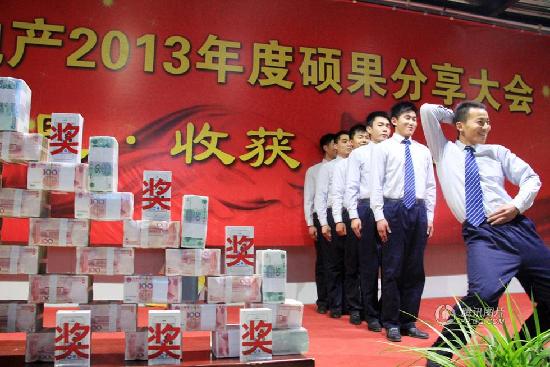 1月21日,河南省柘城县一家地产全体员工欢聚一堂召开“2013年度硕果分享大会”。现场发放工资、奖金总额共达1100万元人民币,有的员工最多发200万元,直接用麻袋装现金。图为企业员工进行才艺表演。摄影:王涛