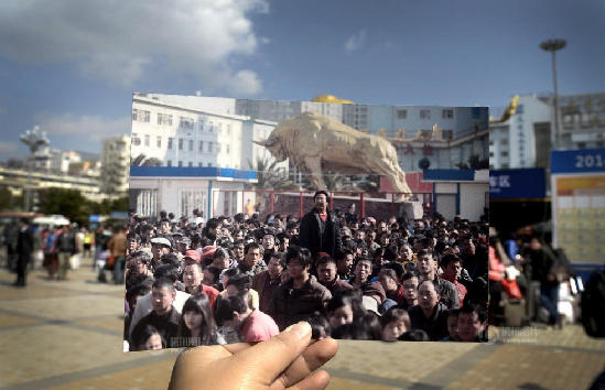 2011年1月13日,昆明火车站站前广场,铜牛下挤满了等待买票的旅客。vs 2014年1月15日,广场上的人流显得稀疏。