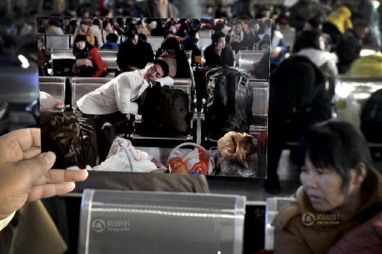 2011年1月19日,候车室内,一名候车的旅客趴在行李上打盹,略显疲倦。