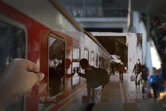 2013年1月22日,昆明火车站站台内,一旅客靠近列车车窗寻找同伴。