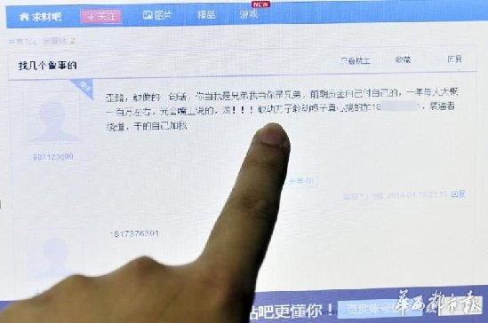 在强迫许先生说出了身上银行卡的密码后,3人用电击棍将他击晕,并把他扔到了小车的后备箱内,随后3人驾车来到高新区中和辖区成仁路边的一个偏僻地方。此时已是下午5点左右,3人将许先生从后备箱内拖出后用汽车防尘布裹了起来,接着又将他抛入一个专门倾倒渣土的基坑内。眼见许先生没有动静,几人便找到铁铲将周围的渣土填入坑内,直至将他完全掩埋起来,3人才驾车逃离了现场。实际上,许先生早已醒来,为了求生,他假装昏迷直至感觉对方已经走远。接着,许先生便在渣土堆里挣扎,因为面部被汽车防尘布隔绝,留有空气,再加上土层只有约半米深,经过40分钟左右的努力,他终于爬出了渣土堆。图为“找几个做事的”的帖子,嫌疑人就是利用类似的帖子征集同伙。