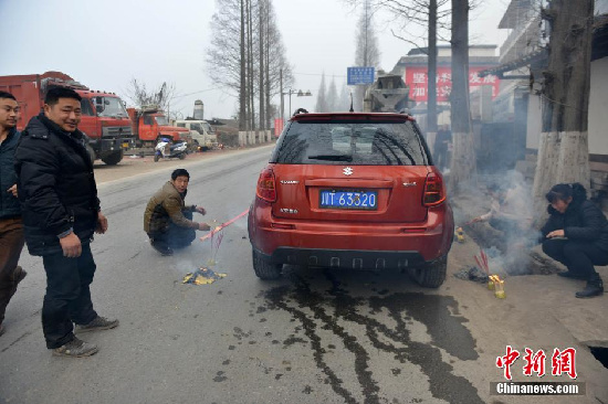 2014年1月28日,在传统的仪式现场,民众用香、蜡、纸、爆竹等将车围满,并用活鸡等物“祭车”,以此祈求来年平安出行。