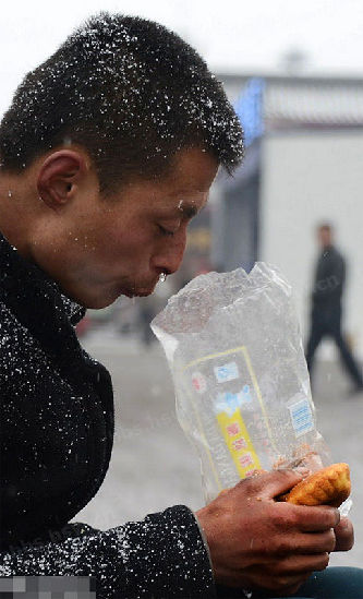 华商论坛网友“严建设”上午驱车来到西安火车站东广场拍雪景,见有一位年轻的农民工兄弟顶风冒雪坐在铸铁老虎车等生意。近前看时,他脸色蜡黄直流鼻涕,还在喀拉喀拉咳嗽,偶尔哆嗦一下,正拿着蛋糕大口吃。想是患感冒了,为了谋生,不得不节省吃饭时间,等在雪地里拉生意。车站广场人流匆匆,没人理会这些事儿。“见我给他拍照,他很高兴,勉强露出一丝笑意致谢。”