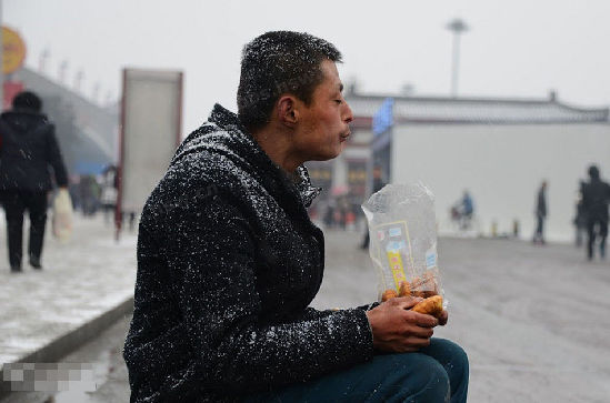 华商论坛网友“严建设”拍摄了一组西安火车站前一农民工顶风冒雪等生意的照片。