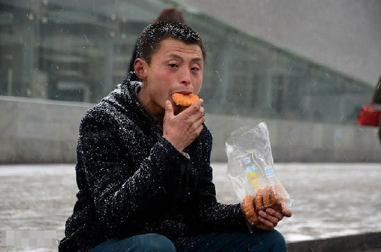 华商论坛网友“严建设”拍摄了一组西安火车站前一农民工顶风冒雪等生意的照片