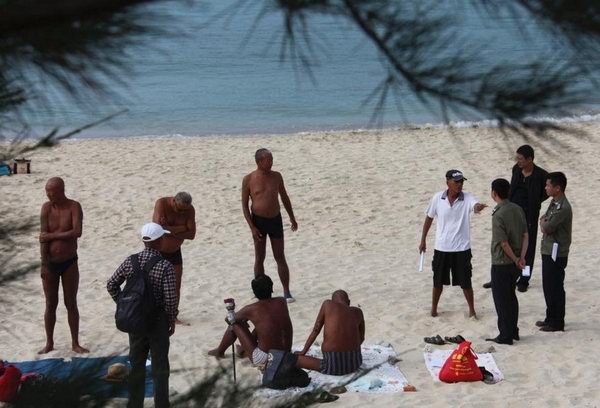 三亚城管整治公共海滩裸泳裸晒 游人不听劝说