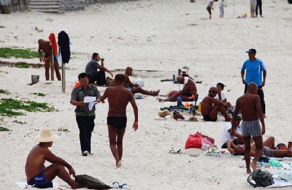 一位执法人员介绍,从2月6日上午开始,执法人员在三亚大东海海滩向游人发放三亚市政府禁止在公共场所裸泳、裸晒的公告,劝说游人不要裸泳、裸晒。