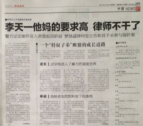 消息称,2013年6月28日,山东《聊城晚报》刊载题为《李天一他妈的要求高,律师不干了》的新闻报道。2013年9月,上海《新民周刊》第35期刊载题为《李某某他妈的舆论战》的封面报道。