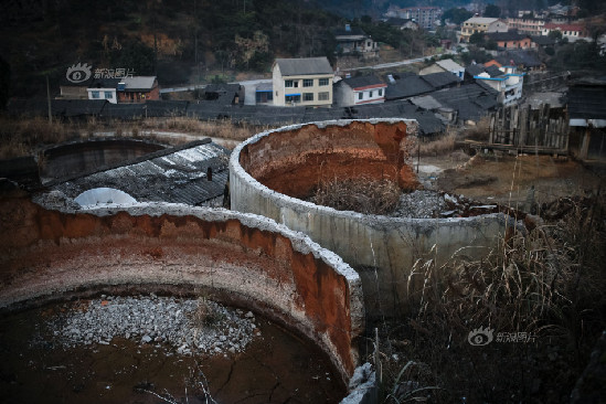 2011年,矿厂因污染严重关停后,不管是矿边的村民还是矿上的职工都面临无力就医的窘境,在矿厂破产改制后才被诊断出砷中毒的部分职工被告知不纳入工伤;而多数罹患癌症的村民在贫穷中默默死去。图为2014年2月13日,湖南石门鹤山村,磺厂矿山上废弃的设施。