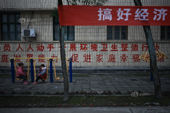 2014年2月16日,在“促进家庭幸福和谐”的标语和“搞好经济普查”的横幅中间,两个小孩在公共体育设施上玩耍。然而不论是职工还是村民都希望能搬迁离开这里,他们说希望孩子能摆脱他们的命运。