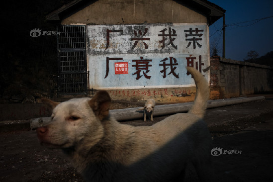 磺厂废弃的材料室外,孤零零游荡着几条野狗,只有墙上的标语还在提醒人们这里曾经的辉煌。当年,村民们都削尖脑袋像到矿上打零工,吃上一口“商品粮”,在那个年代,只有退役士兵和分配的学生才有机会成为这个国有大矿的正式工。
