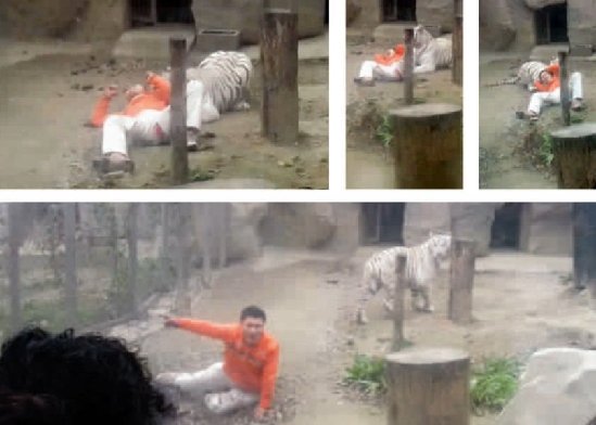 随后,一只被吓退的老虎从10米之外向男子所在方向跑来。“直到这时,男子才开始有点害怕。”一名游客说,橙衣男子连连后退,一边吼着一边和老虎周旋。相持不久,老虎从后面将其扑倒,咬着男子衣服往场地中央拖行。在拖行数米后,老虎开始撕咬男子。“老虎咬人了!老虎咬人了!”顿时,墙外的游客纷纷大叫。正当大家以为男子肯定难逃虎口时,老虎却意外停下了撕咬,开始用鼻子嗅了嗅男子的腿部,然后在他附近徘徊。