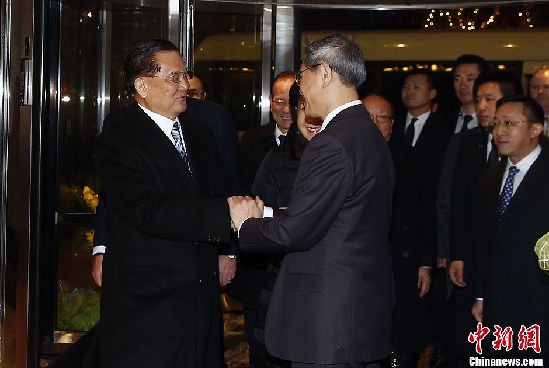 张志军(中)在金融街威斯汀酒店欢迎连战的到来。