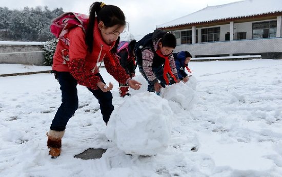 茅坝塘小学学生在操场上滚雪球。