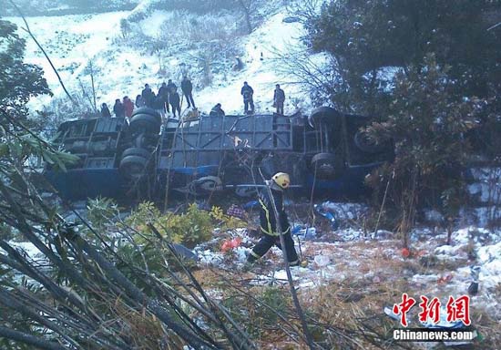 记者从湖南省交警部门了解到,由于路面结冰,19日7时至9时之间,沪昆高速邵阳辖区1233—1217公里段发生14起车祸,至少导致4人死亡,多人受伤,涉及车辆达17台。图为2月19日,一辆牌号为DG0496大客车侧翻至高速公路护坡下。