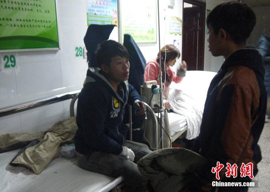 记者从湖南省交警部门了解到,由于路面结冰,19日7时至9时之间,沪昆高速邵阳辖区1233—1217公里段发生14起车祸,至少导致4人死亡,多人受伤,涉及车辆达17台。图为2月19日,湖南省邵阳市,沪昆高速邵东段8车连环相撞,伤员正在接受治疗。 宁四春 摄