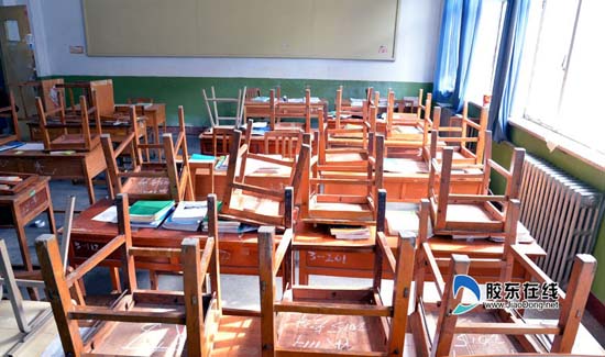 用胶带把板凳和课桌粘在一起占座。(魏琪/摄)