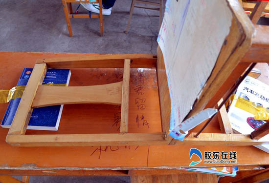 用胶带把板凳和课桌粘在一起。(魏琪/摄)