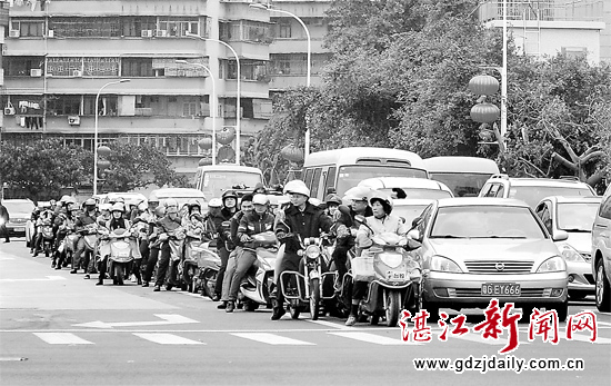 21日下午,赤坎康顺路影剧院附近的路口,车辆正在有序地等待绿灯放行。潘章勇 摄