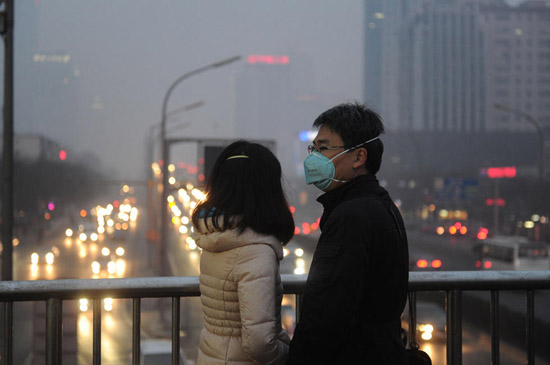 2月22日,两名戴口罩的行人在北京东三环一过街天桥上停留。