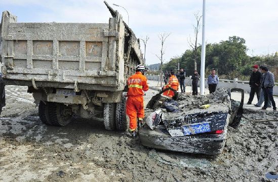 消防赶到现场,在对埋压在车内的人员进行施救。