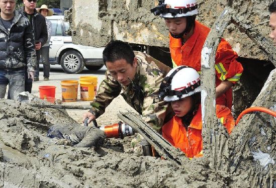 消防赶到现场,在对埋压在车内的人员进行施救。