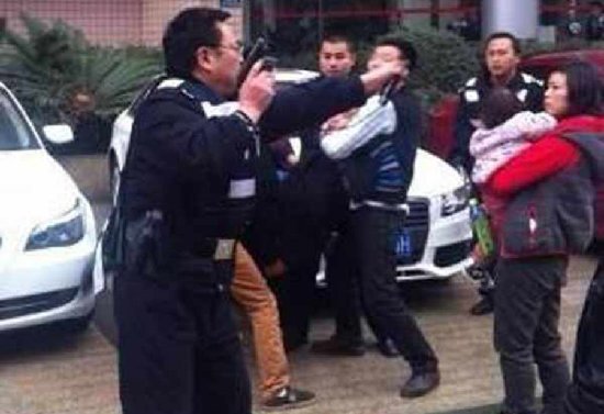 2月24日下午4点,四川成都市公安局金牛区分局茶店子派出所刑侦民警在处理一起纠纷案件时,被当事男子持菜刀砍伤,民警拔枪将砍人男子制服。