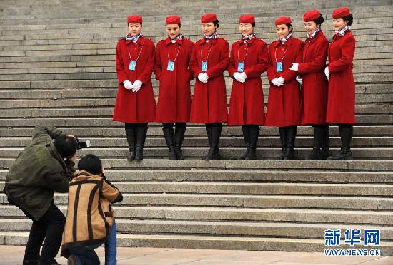 2014年3月3日,全国政协十二届二次会议在人民大会堂举行开幕会。礼宾服务人员成为大会堂外一道靓丽风景。新华网 翟子赫 摄