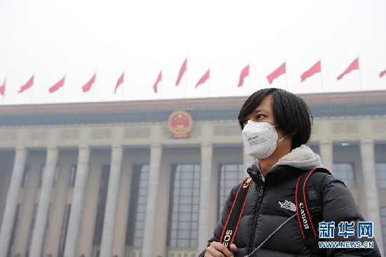 2014年3月3日下午3时,全国政协十二届二次会议在人民大会堂举行开幕会。当日,北京再度迎来一个雾霾天。包括采访两会的媒体记者在内的各路人员,在大会堂东门外的广场上上演了一场口罩Style。新华网 陈竞超 摄