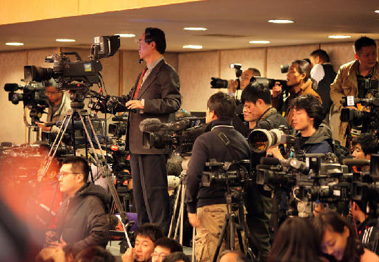 3月4日,记者们陆续达到会场并做好准备。中国网记者 郑亮 摄