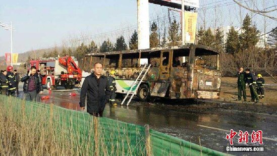 据吉林市政府新闻办官方微博“吉林市发布”消息,3月5日早7点05分,吉林市消防指挥中心接到报警,吉长引线由东向西方向富康木业厂区段,吉林市富康木业公司通勤车行进过程中发生火灾。车辆荷载56人,实载43人。目前初步核定死亡10人,伤17人。事故原因正在调查中。图为事故现场。苍雁 摄