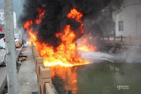 2014年3月5日,浙江温州,一环卫工人在温州瓯海郭溪街道梅屿西路工作时,突然看到河道里一片火光,随后赶紧报警。据附近群众介绍,早上看到该条河面上覆盖着一层厚厚的油污,后来不知什么原因就烧了起来。该报警者也称,当时河面已经浓烟滚滚,现场火焰足足有四五米高。