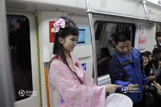 2014年3月9日,一女子扮“名伶李师师”携带“丫鬟”来到郑州地铁站。在地铁站,免费给男性市民发放了价值二十万元某活动演出门票,在发票现场拒绝女士,只发男士,她表示,三八节刚刚过去,女士们收获了祝福和礼物,现在轮到男士了。这一宣传行为在乘坐地铁时引起保安高度戒备,保安们全程“陪护”。李琦 摄