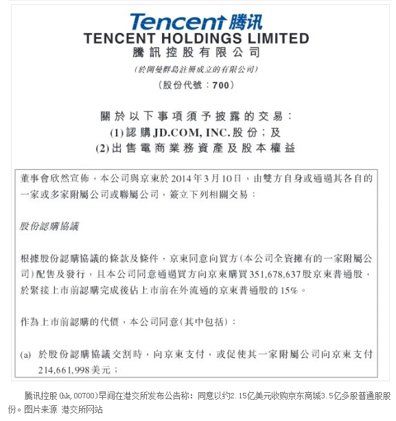 北京时间3月10日上午消息腾讯周一港交所公告:同意约2.15亿美元收购京东3.5亿多股普通股股份,占上市前在外流通京东普通股的15%,占京东上市后在外流通普通股的5%。