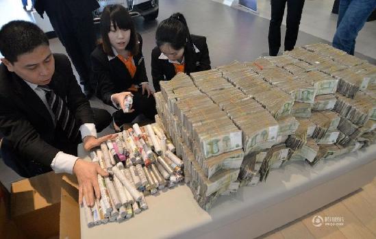 图为4S店工作人员与银行工作人员一起清点零钱。