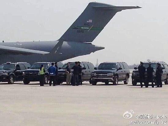3月22日,网友通过微博发布一组照片,米歇尔的车队搭载C-17运输机提前抵达西安。