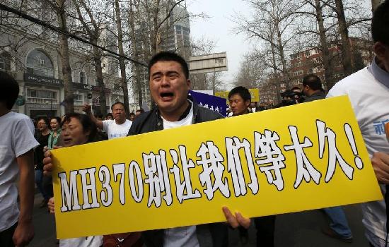 3月25日,马航MH370客机上的乘客家属们前往马来西亚驻华大使馆表达抗议。