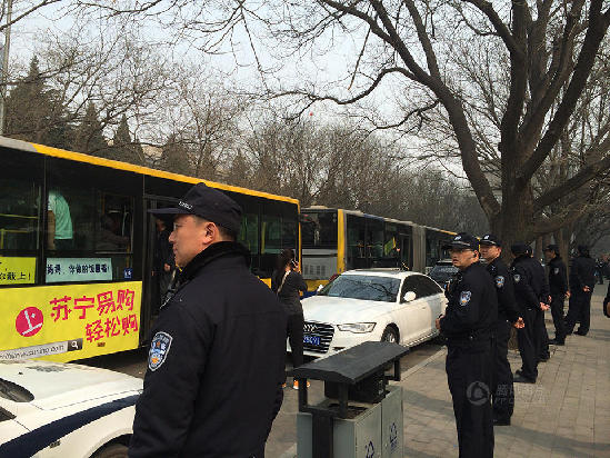 3月25日上午,马航MH370客机上乘客的家属们25日上午走出北京丽都酒店,前往马来西亚驻华大使馆。三辆617公交接家属集体前往马来西亚驻华大使馆。摄影/Muyi