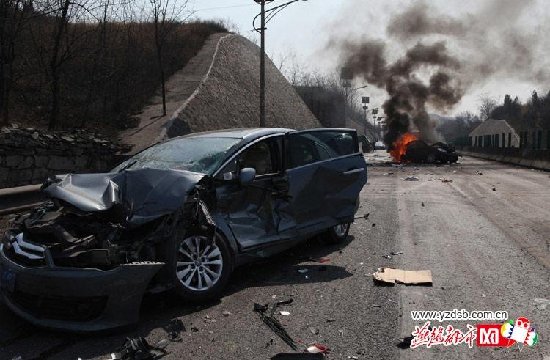 3月22日12点30分左右,京昆高速石家庄方向297公里处发生一起车祸,一辆拉煤的后八轮刹车失控连撞多车,造成一死多伤。一辆山西牌照的“丰田”轿车被挤扁在两大车中间,女车主身亡,其丈夫头部受伤。7岁大的女儿从严重变形的车底爬出,并把3岁的弟弟拽出来,两个孩子仅受轻微伤,堪称奇迹。事故起因是一辆后八轮车在下坡路段,撞上了拉家具的小货车,紧接着没刹住车,连撞了其它车辆,最后撞向一辆丰田轿车,导致丰田车撞到前方货车的尾部,造成丰田车驾驶室严重变形,女司机被困车内最终身亡。图为车牌号尾数为682的雪铁龙轿车已报废,一辆车牌号为冀E· N3906三厢朗逸轿车起火。车主讲“不知道是怎么了,当时都蒙了”。报废的雪铁龙轿车主说“门牙少了一个”。(文图由《河北安全生产》记者郭逢祥 李慧 易丽昕提供)