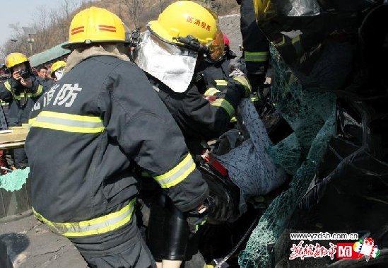 用钢丝绳拉开变形的车框,一个小时后,被困的女司机被救出来送往医院。