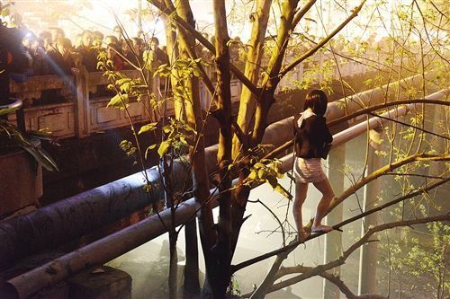长发短裙的“女子”爬上树躲避警方检查。有市民用手电照亮水管,喊其快下来,树上危险。没想到,这名“女子”其实是男儿身。