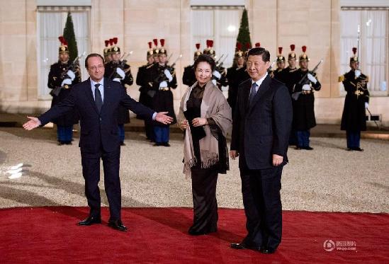 当地时间2014年3月26日,法国巴黎爱丽舍宫,正在法国访问的国家主席习近平与夫人彭丽媛出席法国为其举行的欢迎国宴。