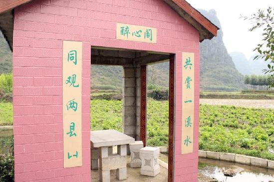 整个像是名胜古迹一般。“土豪墓”由凉亭、台阶、石柱、围墙、祭坛、墓室和石碑组成,墓前有一座红色的凉亭,内有石桌和石凳,凉亭前有潺潺的溪水流过。墓室四周以及基座的石板上,雕刻或镶嵌着不少精美的字画,正后方围墙上有一个石制龙头,似乎在翘首仰望着石碑。红色的石碑高约六七米,下刻“万古城”,上刻“南天一地”,碑顶为黄色的金字塔状尖顶。
