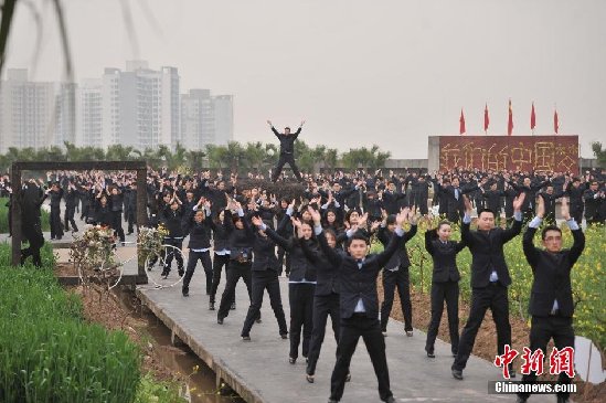 3月27日,重庆某集团员工正在工厂楼顶的田野里做广播体操。为增强员工身体素质,提高工作效率,该集团要求员工每天都要做好广播体操,使得员工身心放松。随着集团楼顶“开心农场”的完善,员工们平日在室内做的广播体操搬到工厂楼顶的田野里,让运动融入田野,让呼吸植根于绿色。企业打造绿色生态的办公环境,营造轻松快乐的工作氛围,让企业在践行中国梦的实际行动中践行生态文明和现代企业文明。陈超 摄