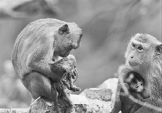 小猴儿干瘪的身体像滩泥一样,不听使唤地往下堆,浑身没有一点血色的它甚至已经发出了恶臭,但猴妈妈还是紧紧把它抱在怀里,摘着身上的杂物。